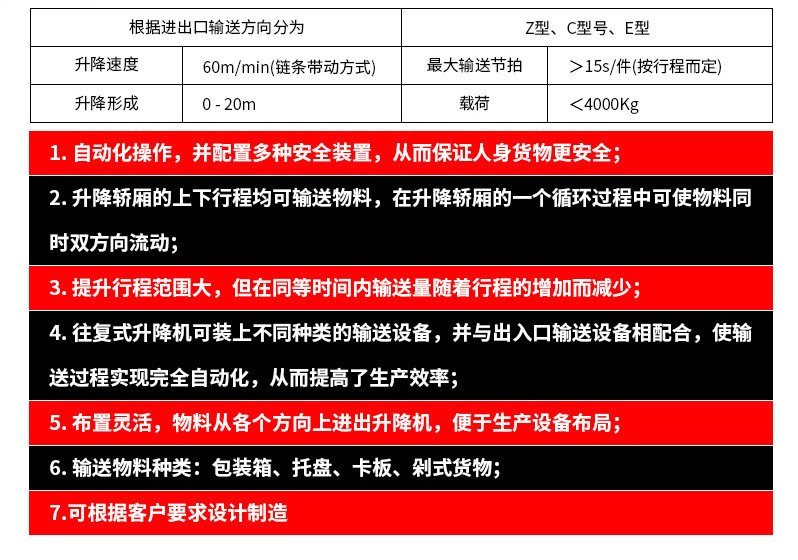 形式多样,布置灵活,物料可以从各个方向上进出提升机,便于生产设备布局;承载范围大,最大可达3000Kg;可设置各种安全装置,提高设备运行的安全性;升降行程为20m;升降速度<30m/min;最大载荷<3000kg;物料种类有包装箱、托板;装饰材料为铝型材+阳光、钢板、铝网等;适用于家电,食品,医药,烟草,机械加工等行业的垂直输送。