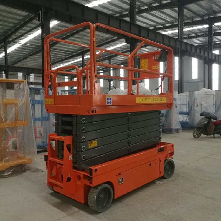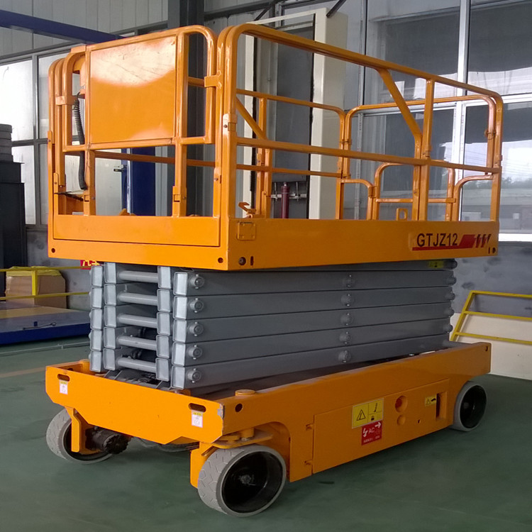 电瓶自行式高空作业平台,它具有自动行走的功能,能够在不同的工作状态下,快速、慢速行走,只需要一个人就可以在空中连续完成上下、前进、后退、转向等所有动作。特别适合机场候车楼、车站、码头、商场、体育场馆、小区物业、厂矿车间等大范围的高空作业。SJYD系列是利用自身动力在工作场地或场地之间行驶的剪叉式高空作业平台。高空可行走是SJYD系列平台的一种特性,所以,单人就可完成高空连续性作业;另一种特性是平台可移出,扩大了工作范围,可满足部分用户的特殊需要。平台配有水平报警装置(此部分为用户可选择部分),可增大平台和使用在工作过程中的安全保障。SJYD系列平台具有台面工作面积大,升降平稳,噪音小,安全可靠等特点。