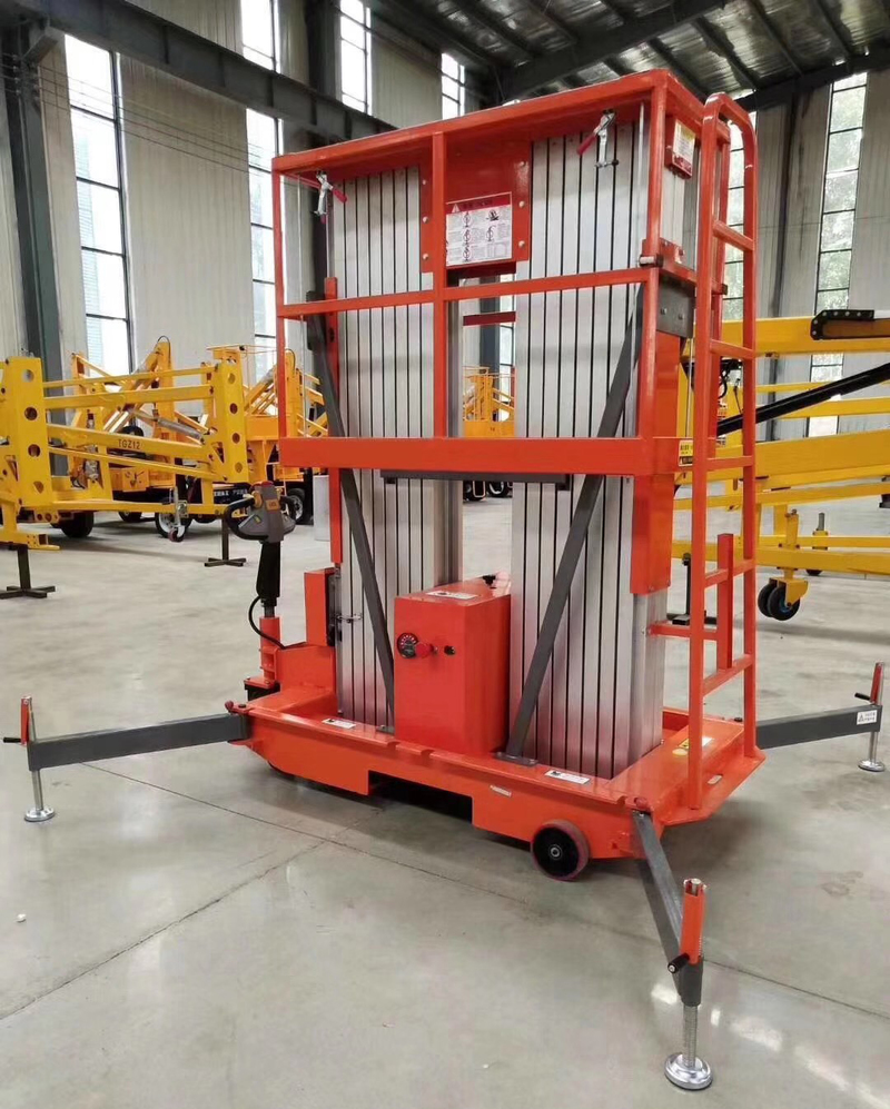 铝合金式升降机采用铝合金材料,具有造型美观、体积小、重量轻、运转灵活,推行方便、升降平稳、安全可靠等优点。它轻盈的外观,能在小的空间内发挥好的举升能力。广泛用于工厂、宾馆、餐厅、车站、影剧院、展览馆等场所,是保养机具、油漆装修、调换灯具、电器、清洁保养等用途的伴侣。