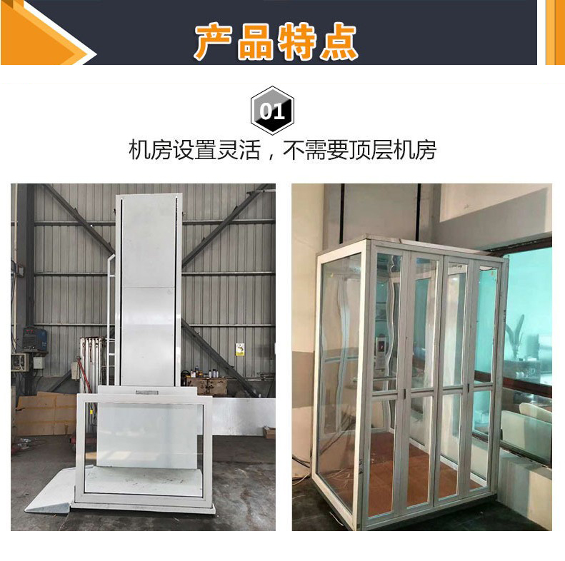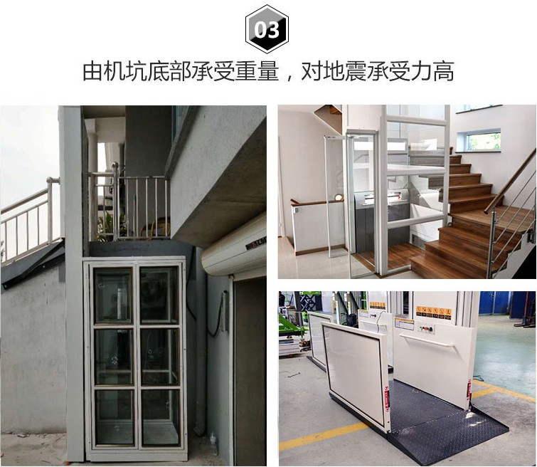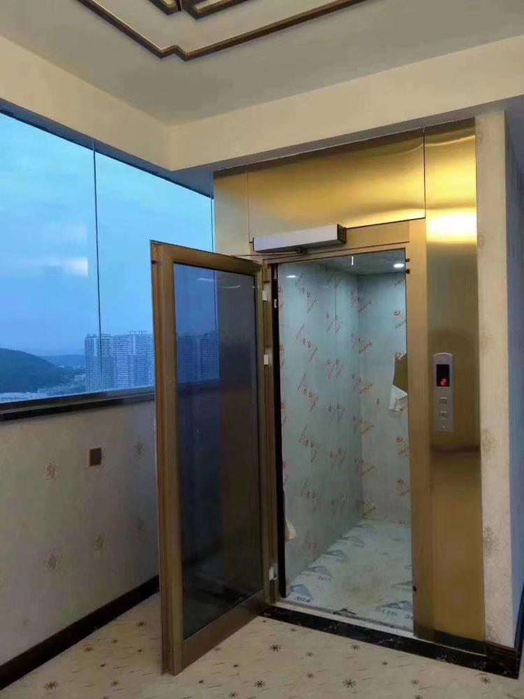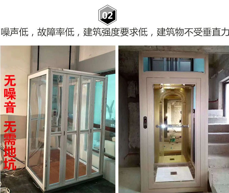 曳引家用电梯或别墅电梯:井道及地坑、轿厢、层站部分;主要部件:曳引系统、导向系统、门系统、轿厢、重量平衡系统、电器控制系统、安全保护系统,电气方面的安全保护在电梯的各个运行环节都有,这种电梯同小区电梯相同。安静平稳、价格经济、乘坐舒适,方便残疾人和老年人使用的家居电梯。