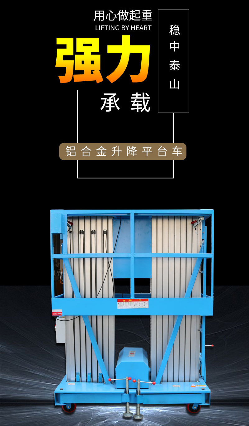 特点:采用高强度优质铝合金材料,具有造型美观、体积小、重量轻、升降平稳、安全可靠等优点。它轻盈的外观,能在小的空间内发挥好的举升能力。立柱升降系统,具有载量大,稳固性强,平台面积大,推行方便等特点。
