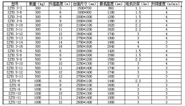 根据升降机高度分为4、6、8、10、12、14、16、18米,载重分为:300、500公斤、1000公斤和2000公斤不等其它载重量可以订制加工。